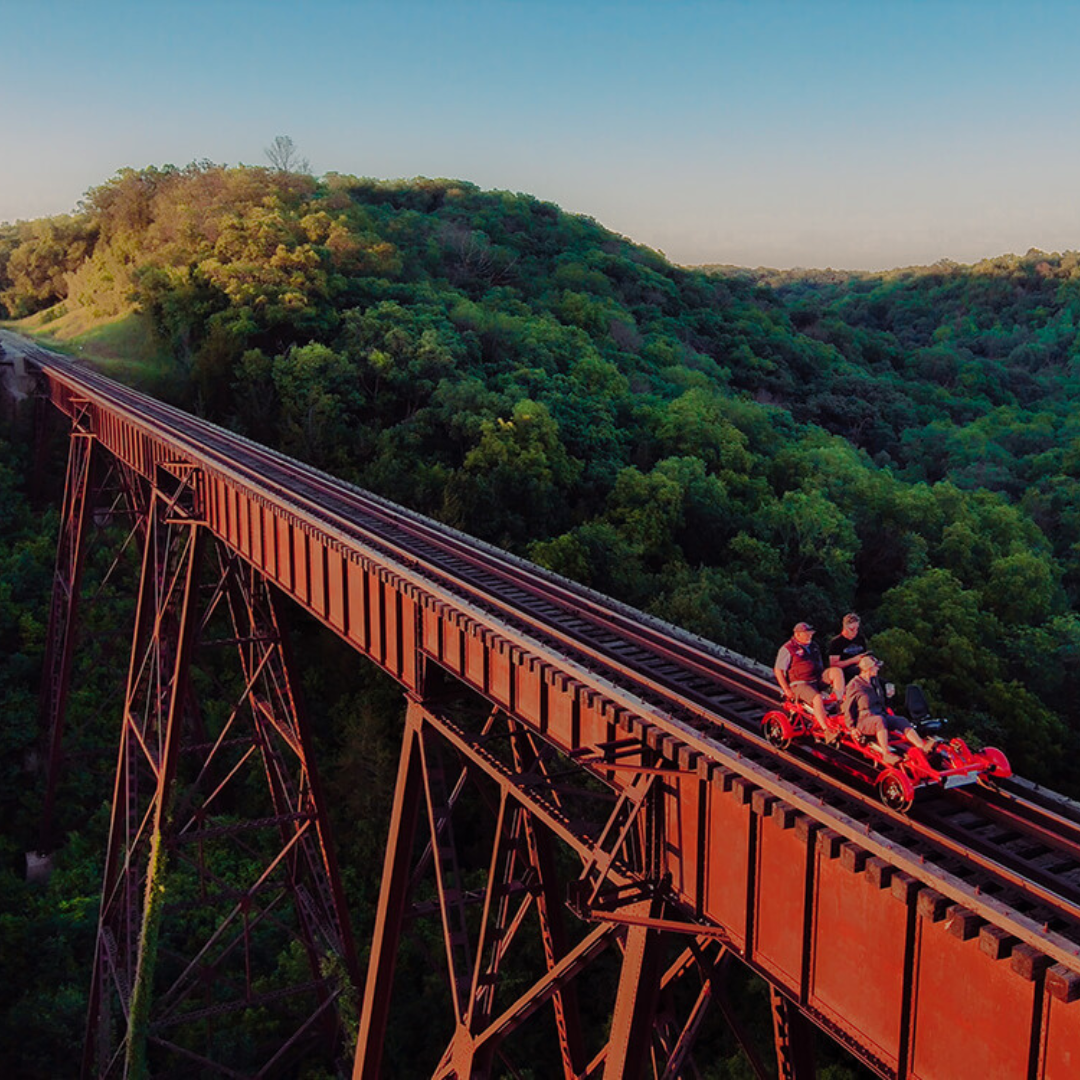 The perfect retreat in Boone, Iowa, ideally located to explore the area's top attractions, from scenic and historic sites to thrilling outdoor adventures or peaceful moments of relaxation. (Rail Explorers Pictured)